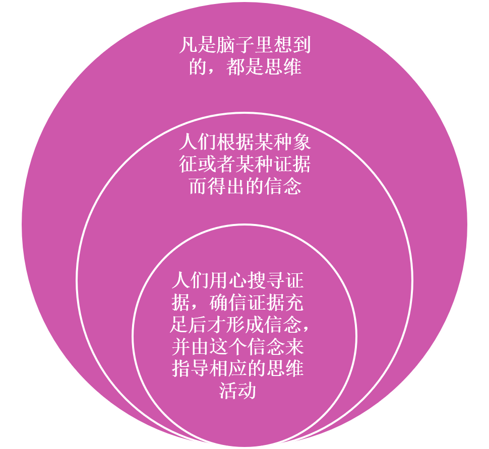 凡是脑子里想到的,都是思维活动,这是一个十分广泛的问题。但是,我们这里要关注的,是思考,是人们根据某种象征,或者某种证据而得出信念的思维活动;尤其是人们用心搜寻证据,确信证据充足后才形成信念,并由这个信念来指导相应的思维活动。